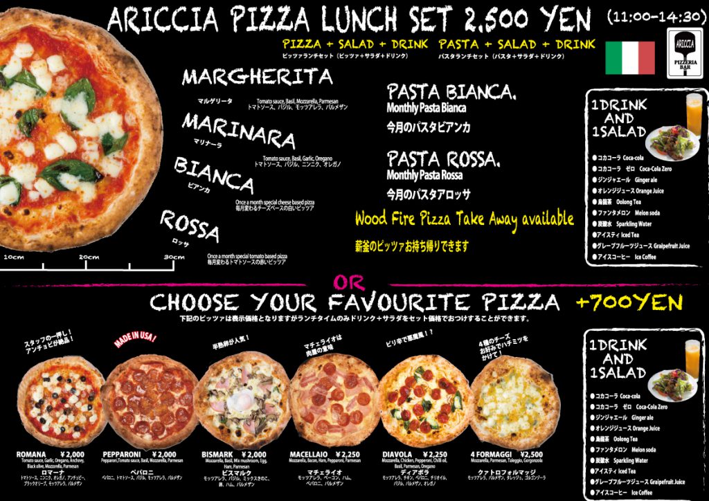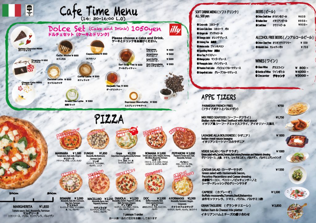 トマトソース、バジル、モッツァレラ、ナス、タマネギ、ブラックオリーブ、ピーマン、パルメザンチーズ